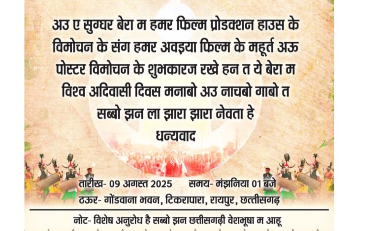फिल्म प्रोडक्शन हाउस द्वारा आयोजित इस रंगारंग कार्यक्रम में आदिवासी लोकनृत्य, गीत-संगीत और पारंपरिक पहनावे के साथ प्रतिभागियों ने अपनी छत्तीसगढ़ी अस्मिता का उत्सव मनाया जाएगा। पोस्टर विमोचन जिसे खासतौर पर आदिवासी जीवन और संघर्ष को केंद्र में रखकर बनाया गया है। आयोजकों ने सभी से अपील की कि वे छत्तीसगढ़ी वेशभूषा में आकर अपनी संस्कृति को गर्व के साथ जीएं और दिखाएं।